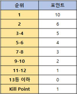 · 2개 맵의 킬, 순위 포인트 합산으로 순위 산정, 동점 발생 시 3.3.3.4 포인트 동점 시 우선 순위 항목에 따라 순위 결정하여 3라운드 추가 진행
