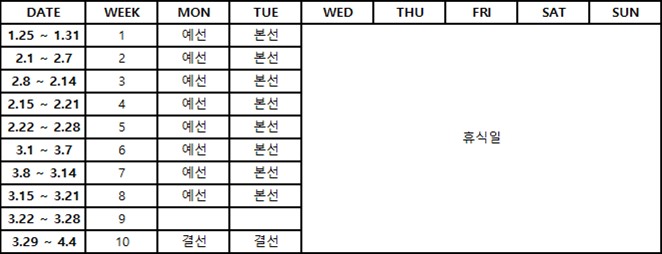 본 대회는 2021년 1월 25일 월요일 ~ 3월 30일 화요일에 개최되며, 상세한 대회 일정은 아래와 같다.